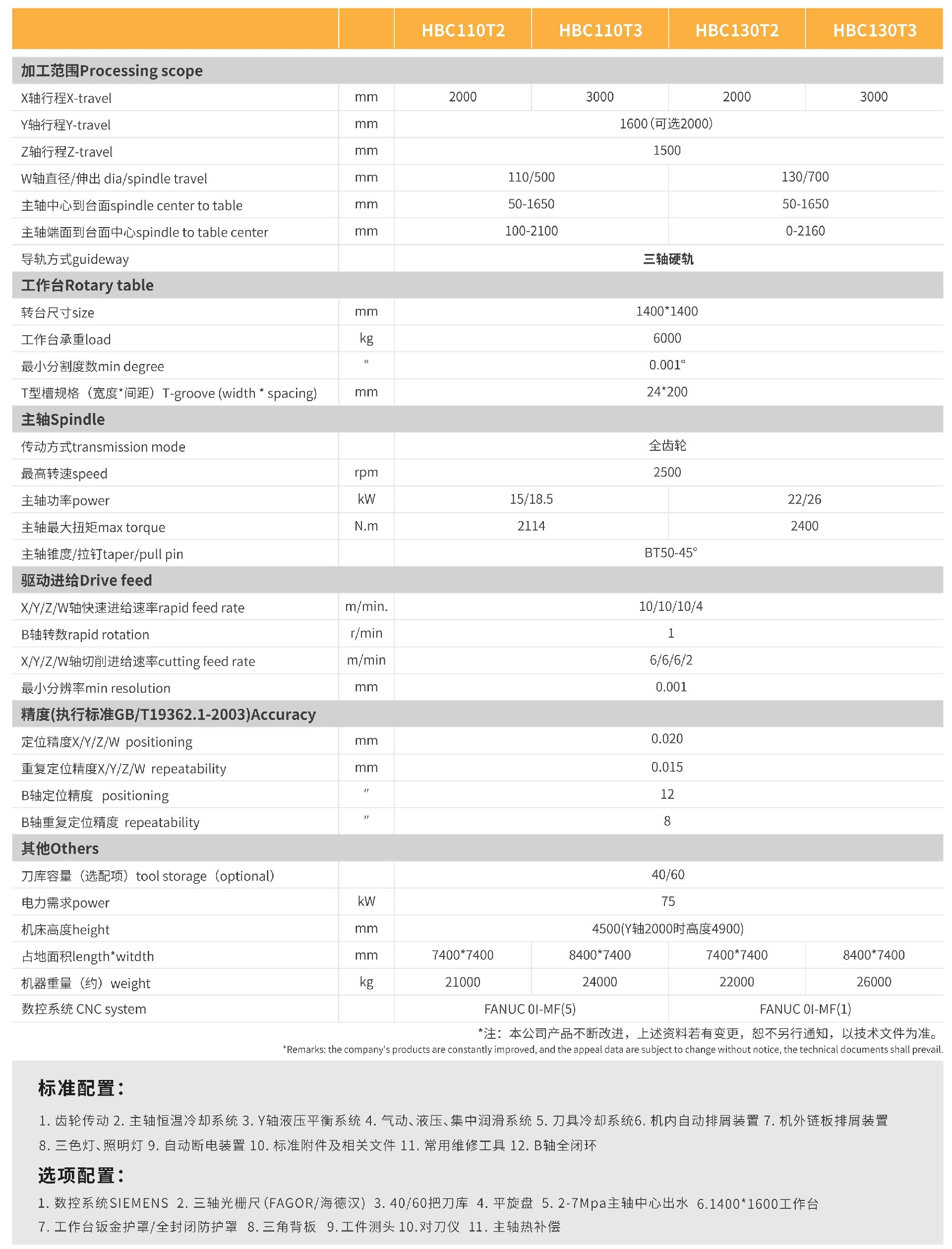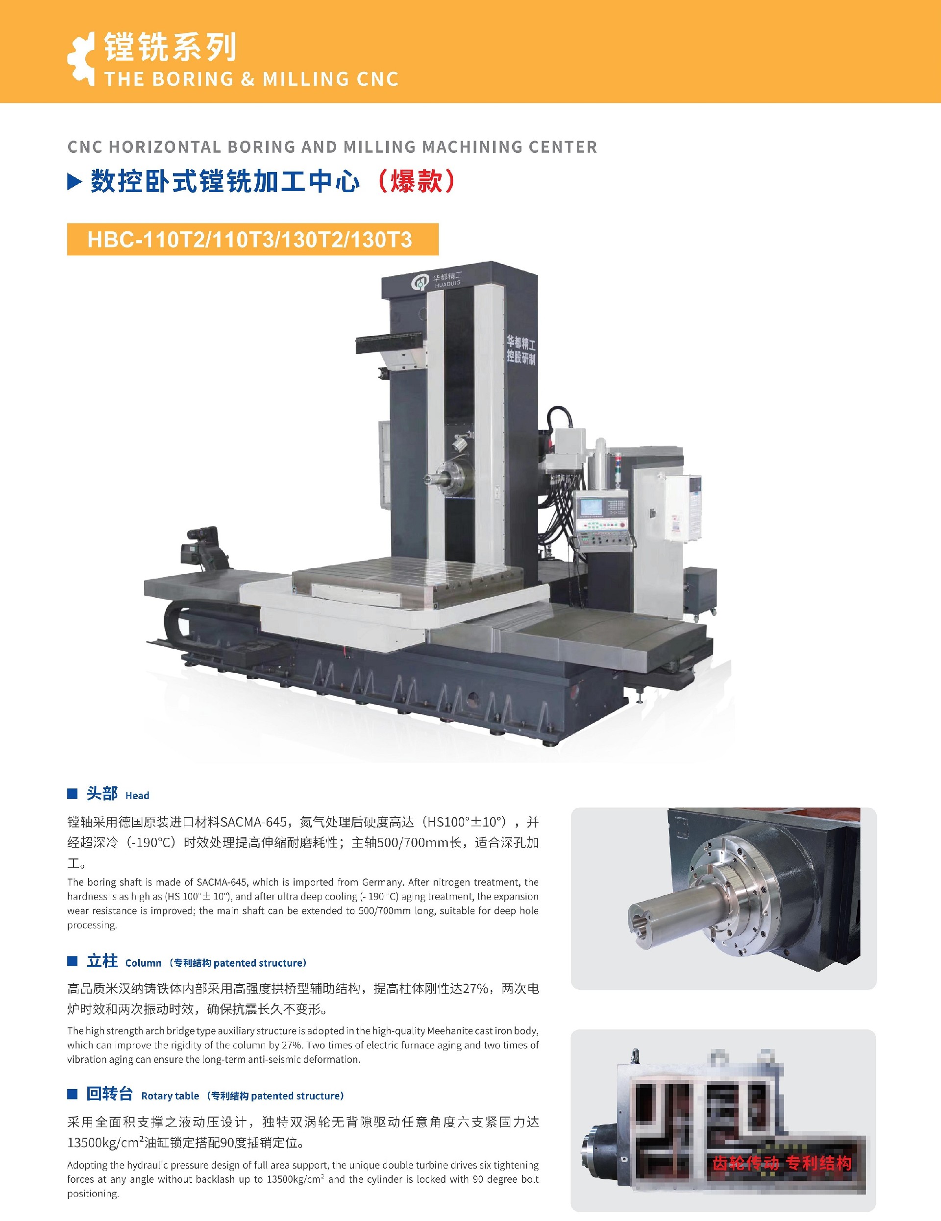 頭部 :鏜軸采用德國(guó)原裝進(jìn)口材料SACMA-645,氮?dú)馓幚砗笥捕雀哌_(dá)(HS100°士10°),并經(jīng)超深冷(-190°C)時(shí)效處理提高伸縮耐磨耗性;主軸500/700mm長(zhǎng),適合深孔加工。立柱:高品質(zhì)米漢納鑄鐵體內(nèi)部采用高強(qiáng)度拱橋型輔助結(jié)構(gòu),提高柱體剛性達(dá)27%,兩次電爐時(shí)效和兩次振動(dòng)時(shí)效,確??拐痖L(zhǎng)久不變形; 回轉(zhuǎn)臺(tái):采用全面積支撐之液動(dòng)壓設(shè)計(jì),獨(dú)特雙渦輪無(wú)背隙驅(qū)動(dòng)任意角度六支緊固力達(dá)13500kg/cm2油缸鎖定搭配90度插銷定位。